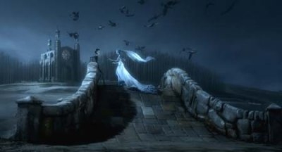 In this image taken from "Tim Burton's Corpse Bride", captures Victor's fear and the Corpse Bride's joy as their pending marriage draws near. Available unframed only.