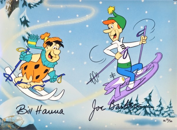 This is a hand-painted limited edition animation cel featuring Fred Flintstone and George Jetson. This is signed by Bill Hanna and Joe Barbera. Last piece in the edition. 950
