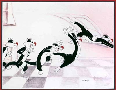 This is a hand-painted cel featuring Sylvester. This is signed by Virgil Ross. Classic animator, Virgil Ross, who is best known for his distinctive style, character personality and fluid animation, recreates the true sense of animation in this multiple image limited edition entitled, the “Sequential Series.” This artwork debuts Sylvester in five exquisite poses in a classic scene from “A Mouse Divided.Edition is sold out...we have ONE ONLY!