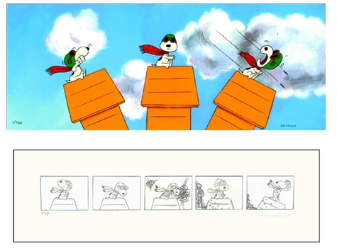 This is a hand painted and inked limited edition cel with storyboard giclee print derived from the television special "It's the Great Pumpkin, Charlie Brown". As the kids go out for an evening of trick or treats, Snoopy escapes into his world as the "Flying Ace". Available unframed only. Featured here is Snoopy.