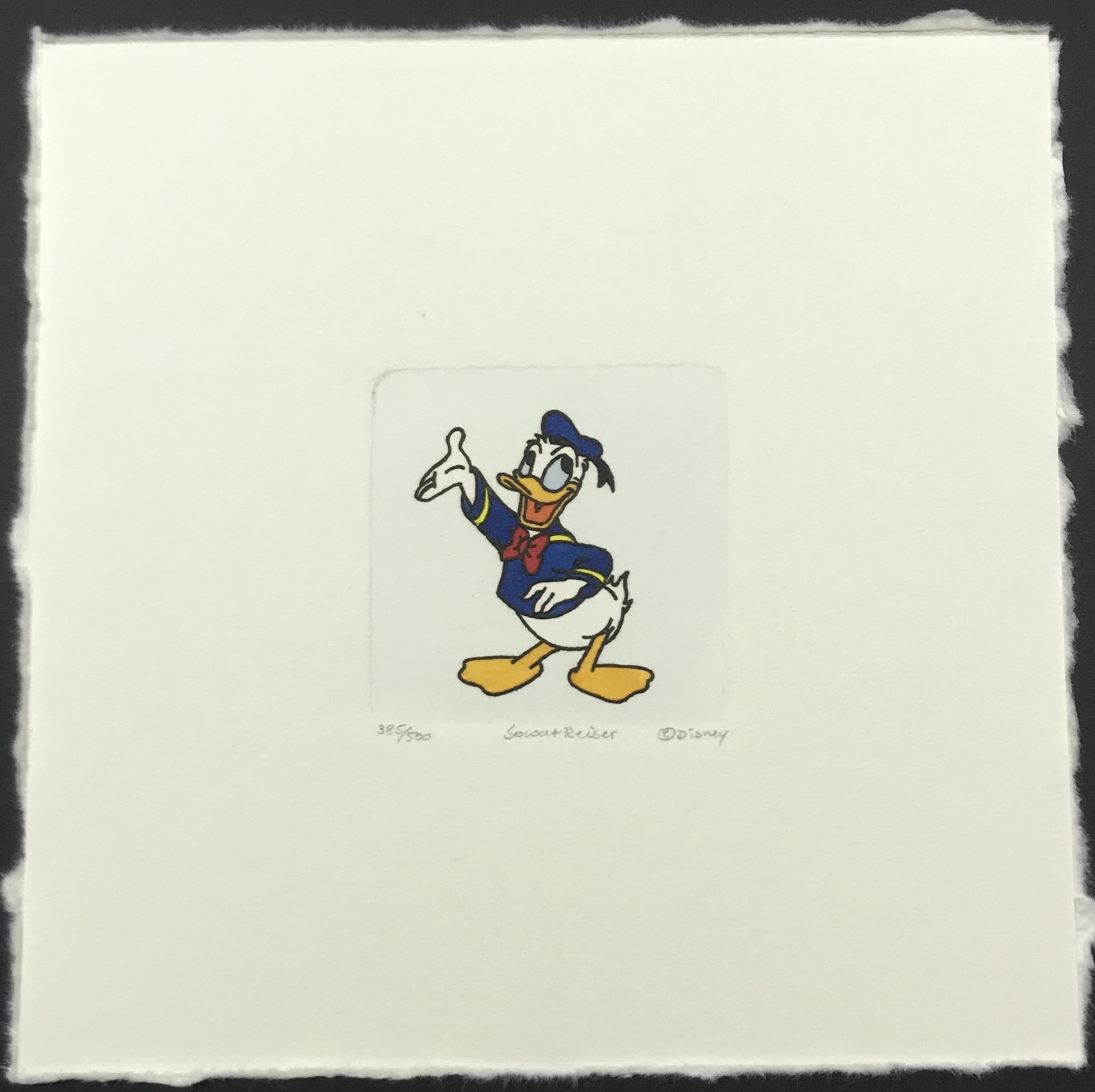 Donald Duck stands proud in this wonderful animation artwork. This is a limited edition hand painted etching. Featured here is Donald Duck. Available framed for only $129US! OUT OF STOCK