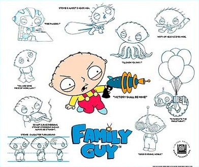 Victory Shall Be Mine! Stewie Griffin is the first family member featured in a series of hand-painted animation model sheets from the animated series "Family Guy." This image features a Stewie hand-painted cel set against a fine art giclee background that depicts various rough drawings taken from "Family Guy" original production artwork.280