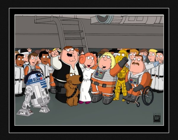 When the power goes out in the Griffin home, Peter decides to educate his family and pass along the greatest story ever told - the story of Star Wars! This piece features Peter as Han Solo, Chris as Luke Skywalker, Lois as Princess Leia, Brian as Chewbacca, Cleveland as R2D2, Quagmire as C3PO, Joe as Wedge and comes pre-matted.89
