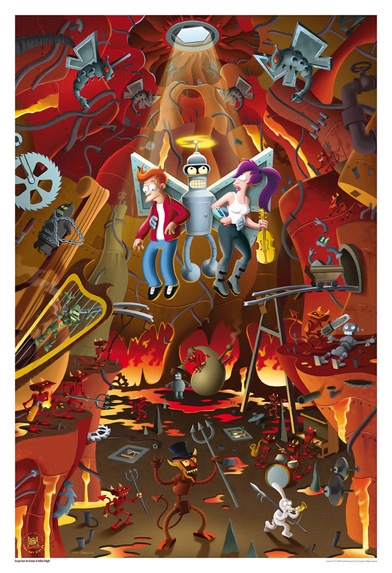 Escape from the Bowels of Hellish Delight In this unique vision, an angelic Bender lifts Leela and Fry out of the clutches of the fiendish Robot Devil. This is a limited edition giclee on canvas. Also available in a paper edition.