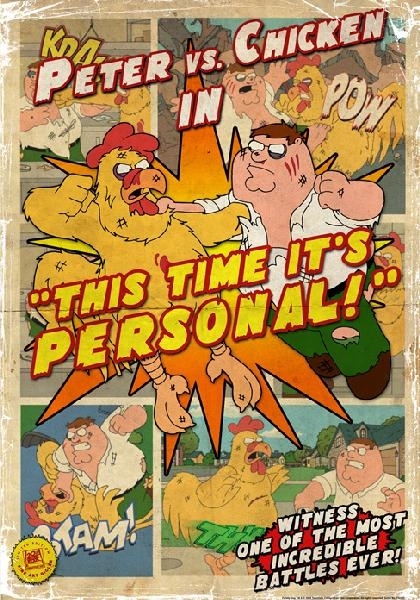This Time It's Personal. Using images from "No Chris Left Behind" (5ACX11), this piece emulates a comic book splash page featuring the highlights of the epic fight between Peter and the Giant Chicken. This is a limited edition giclee on paper.