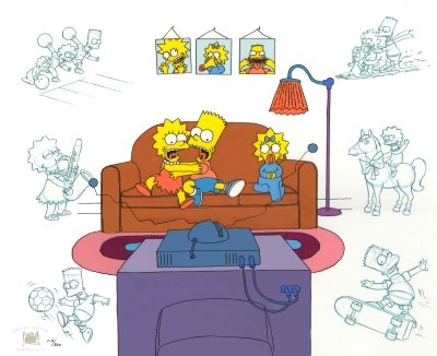 Bart Simpson, Lisa, and Maggie together on one great animation cel. Main image is hand-painted, surrounding images are lithographed on the background.550