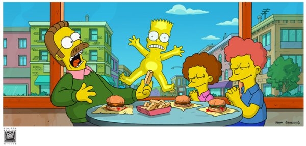 This unique moment from "The Simpsons Movie" features a naked Bart stuck to the window while the Flanders family attempt to say grace before a meal.