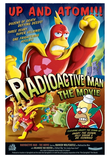 Radioactive Man: The Movie, staring Rainer Wolfecastle, Milhouse Van Houten as Fallout Boy and Krusty the Clown as Angry Sailor, Silly Sailor & Dr. Clownius!