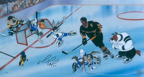 This is a hand painted limited edition cel. Strap on those skates and clear off that Zamboni – it’s face-off time as National Hockey League legend Mario Lemieux comes out of retirement for one last game in “Goal, Lemieux!†the limited edition cel. This limited edition cel began with a Kirk Mueller layout drawing then each cel was hand painted by studio artists. Each cel was ink-enhanced by hand before being hand-painted on the reverse side. The background by Hector Martinez was reproduced on acid-free paper using a fine art lithography process. Along with approval from the National Hockey League, each “Goal, Lemieux!†bears the signature of Mario Lemieux. The edition number was hand-inked on each cel in a special edition size of only 350 pieces.