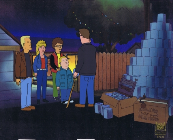 This is an original hand painted production cel used in making an episode of "King of the Hill". King of the Hill is an animated series created by Mike Judge and Greg Daniels, that ran from January 12, 1997 to September 13, 2009 on Fox. It centers on the Hills, a small-town Methodist family in Arlen, Texas. It attempts to retain a realistic approach, seeking humor in the conventional or mundane aspects of everyday life. SOLD CALL FOR SIMILAR IMAGES.