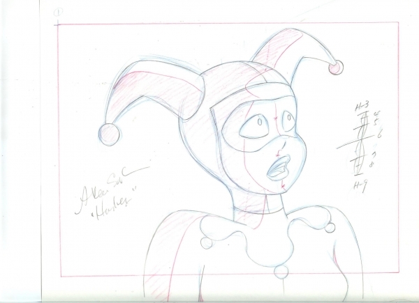 This is an original production drawing of Harley Quinn. This is signed by Arleen Sorkin. SOLD CONTACT FOR SIMILAR IMAGES.
