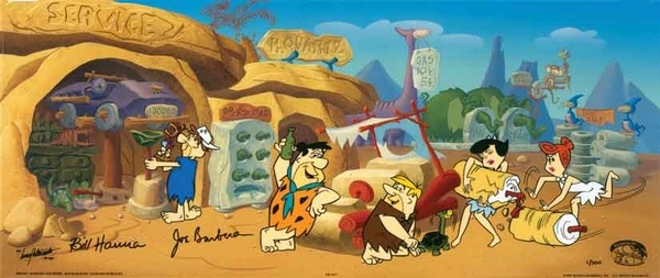 Fred Flintstone, Barney Rubble, Wilma and Betty work together in this hand painted limited edition cel. Due to the large size this is not available framed outside US and Canada.1075