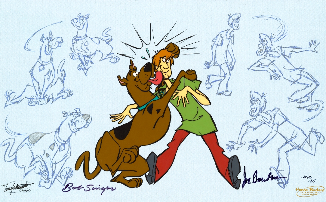 Zoinks! This animation cel is totally cool! This hand painted cel features Scooby-Doo and his best friend, Shaggy. The blue background features rough sketches of both characters in action. This has been signed by Joe Barbera and Bob Singer. Note edition number will be different from image.