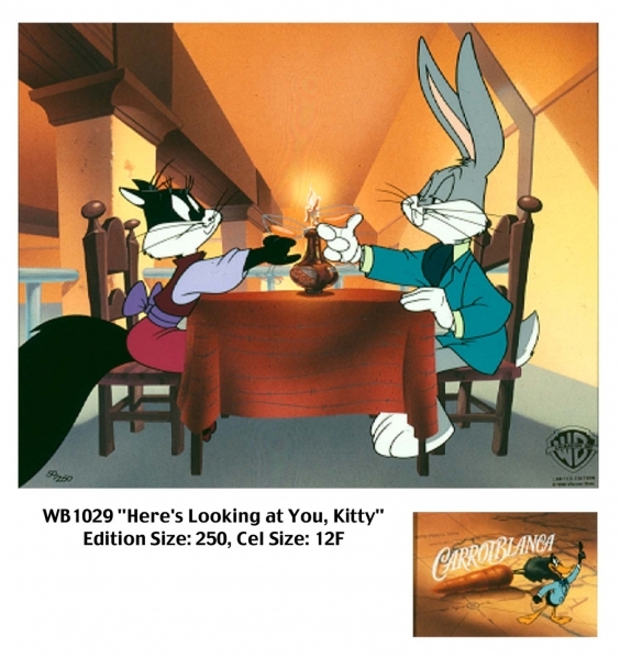 This is a hand painted limited edition cel from Warner Bros. cartoon "Carrotblanca". A spoof of the classic film Casablanca. The 1995 short involves nearly all the major Looney Tunes characters in roles from the film, including Bugs Bunny as Rick, Daffy Duck as Sam, Pepe Le Pew as Captain Renault and Tress MacNeille as Penelope Pussycat. Note: the wording is not part of the artwork and will be covered when framed. The small Carrotblanca card is separate.