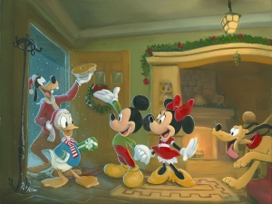 This is a beautiful limited edition giclee on canvas featuring Mickey Mouse, Minnie Mouse, Donald Duck, Goofy, and Pluto. This heart warming and inviting limited edition is personally signed by artist Rob Katz.