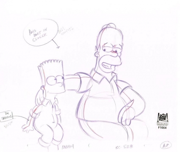 This is an original production drawing used in making an episode of "The Simpsons". Featured here is Homer and Bart.