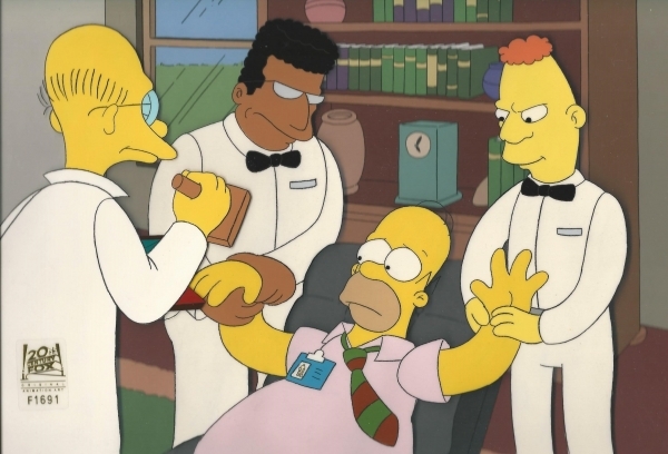 This is an original hand painted production cel used in making an episode of "The Simpsons". Episode title "Stark Raving Dad" 1991. Featured here is Homer Simpson.510