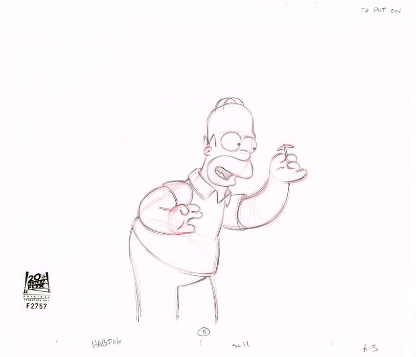 This is an original production drawing used in making an episode of "The Simpsons". Episode title "The Seemingly Never-Ending Story" 2006. Featured here is Homer Simpson. 200