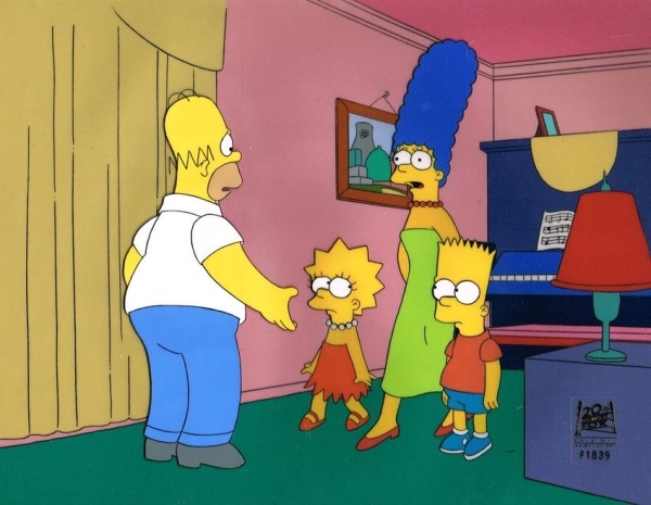 This is an original hand painted production cel used in making an episode of "The Simpsons". Featured here is Homer Simpson, Marge, Bart and Lisa. Episode title "Homer Badman" 1994. SOLD