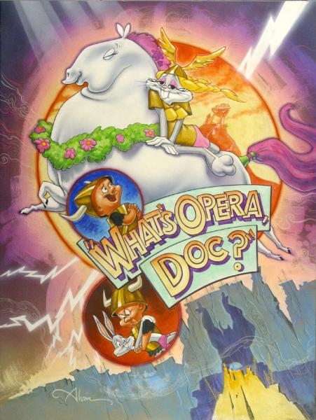 A movie poster featuring Bugs Bunny and Elmer Fudd in "What's Opera, Doc?" as imagined by renown artist John Alvin.