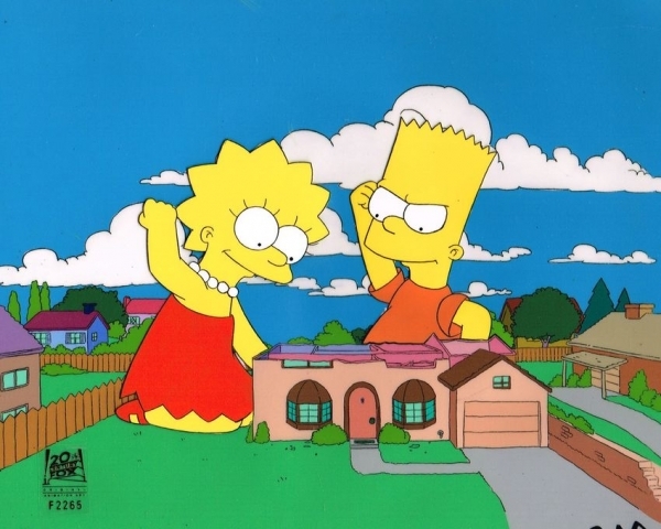 This is an original production background with production cels used in making an episode of "The Simpsons". Featured here is Bart Simpson and Lisa Simpson. SOLD