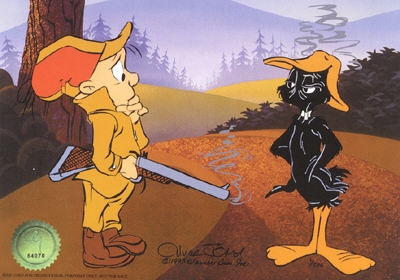 A classic cartoon moment captured in this wonderful limited edition animation cel! Chuck Jones' three hunting films of the early 1950's were some of the best Bugs Bunny, Daffy Duck, and Elmer Fudd cartoons ever made. 1350