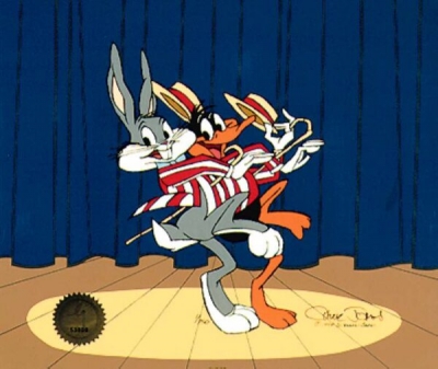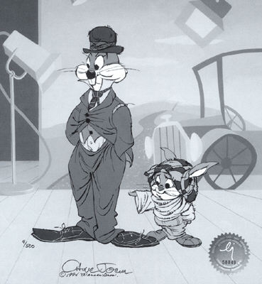 A nostalgic tribute to Chuck Jones' comedic hero Charlie Chaplin featuring Bugs Bunny and Baby Bugs in this limited edition animation cel.