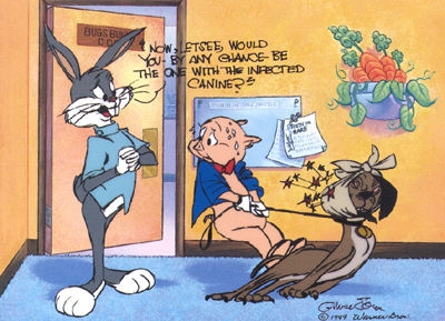 A great limited edition animation cel for the dentist in the family featuring Bugs Bunny and Porky Pig. This has the Chuck Jones Estate Mark.