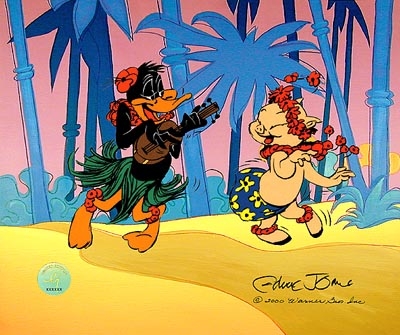 Daffy Duck and Porky Pig do the hula dance in this hand-painted limited edition cel signed by Chuck Jones.