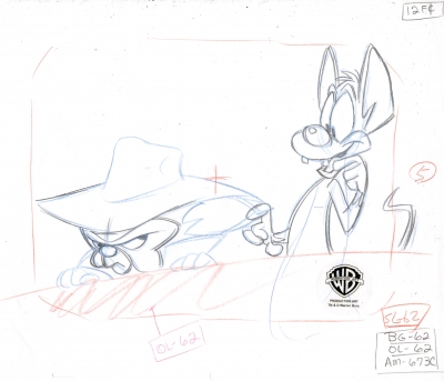Daffy Duck trying to cross-examine the unflappable Bugs Bunny with limited success in this animation cel for the lawyer in your family. This piece bears the Estate Signature Mark of Chuck Jones.