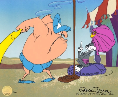 Bugs Bunny had his hands full with Hassan, the muscle-bound treasure guard in the 1957 classic "Ali Baba Bunny". This animation cel bears the Official Chuck Jones Estate Signature Mark.