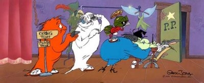 Gossamer, Abominable Snowman, Marvin Martian & Witch Hazel are all trying out for the role of 'Stinker Belle' while Bugs Bunny plays Peter Pan.