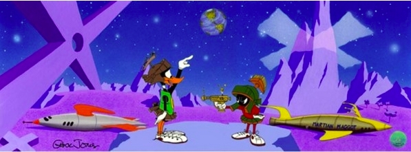 Upholster your pea-shooter, Doc, for I too am a creature from another planet - that one! Daffy Duck points to the Planet Earth in his first meeting with the Martian Commander X-2, also known as Marvin Martian. "Creature From Another Planet" has been created from an original line drawing by Chuck Jones. This imaginative re-telling of their first meeting (so comically captured in Jones' 1953 masterpiece of interplanetary shenanigans "Duck Dodgers in the 24 1/2 Century") is complemented by Maurice Noble's background design for Planet X from the same movie. This is a limited edition hand painted cel with autopen estate signature mark. Featured here are Marvin the Martian and Daffy Duck.