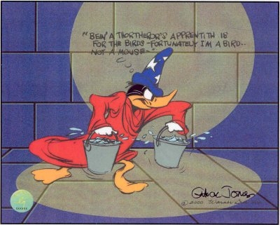 A wonderful send-up of a classic moment in animation film history: the sorcerer's apprentice as interpreted by Daffy Duck. As Daffy says, "Bein' a thortheror's apprentith is for the birds - fortunately I'm a bird... not a mouse".