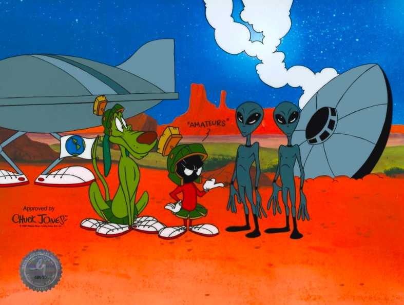 In 1947 a mysterious object is reported to have crashed near Roswell, New Mexico. A year later Chuck Jones introduced the world to Marvin Martian and his side-kick K-9. Coincidence? We think not! This limited edition animation cel commemorates the 50th anniversary of the Roswell incident.