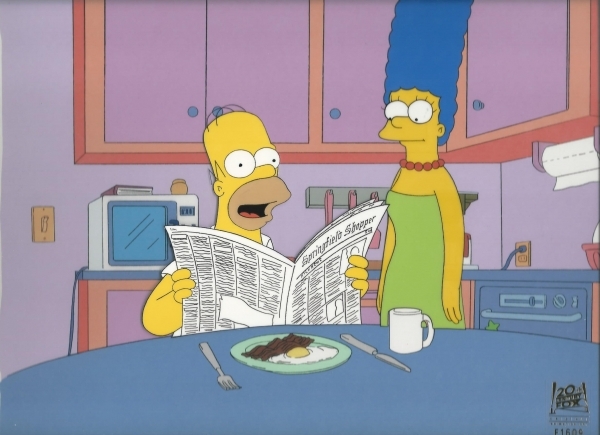 This is an original hand painted production cel used in making an episode of "The Simpsons". Episode title "Treehouse of Horror XI" 2000. Featured here is Homer Simpson and Marge Simpson.510