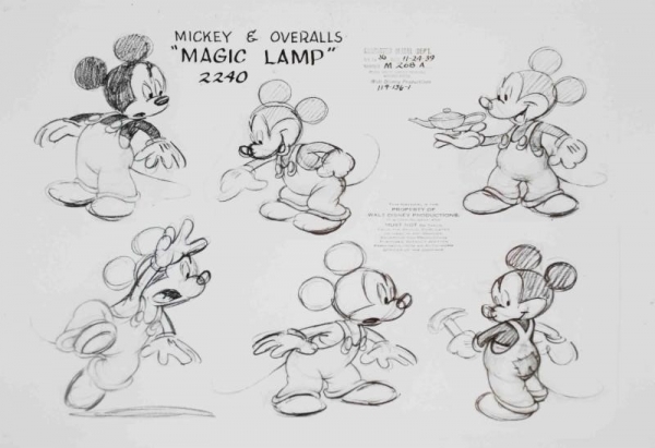 This is an original model sheet used in making the Walt Disney storybook "Magic Lamp" 1942. Featured here is Mickey Mouse. SOLD CALL FOR SIMILAR PIECES.