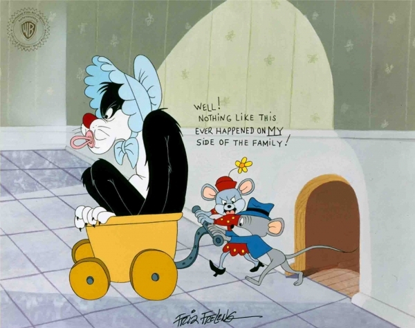 This is a hand painted limited edition cel. Inspired by the final scene in Friz Freleng's classic 1953 cartoon "A Mouse Divided" Sylvester finds himself in a bonnet and baby carriage the victim of an inebriated stork. Each piece is signed by the late Friz Freleng.