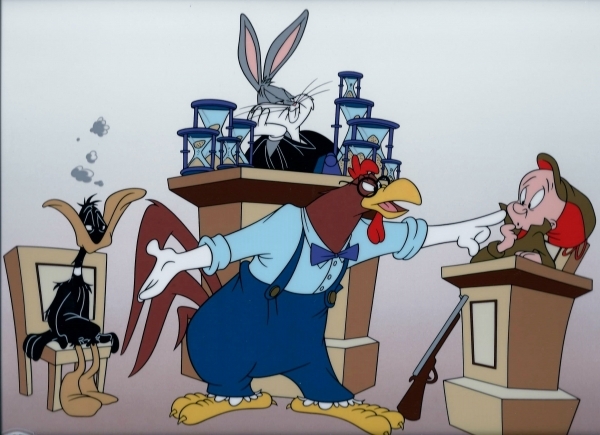 This is a limited edition serigraph animation cel. Featured here is Foghorn Leghorn, Bugs Bunny, Elmer Fudd and Daffy Duck. We have one left in the edition. 450
