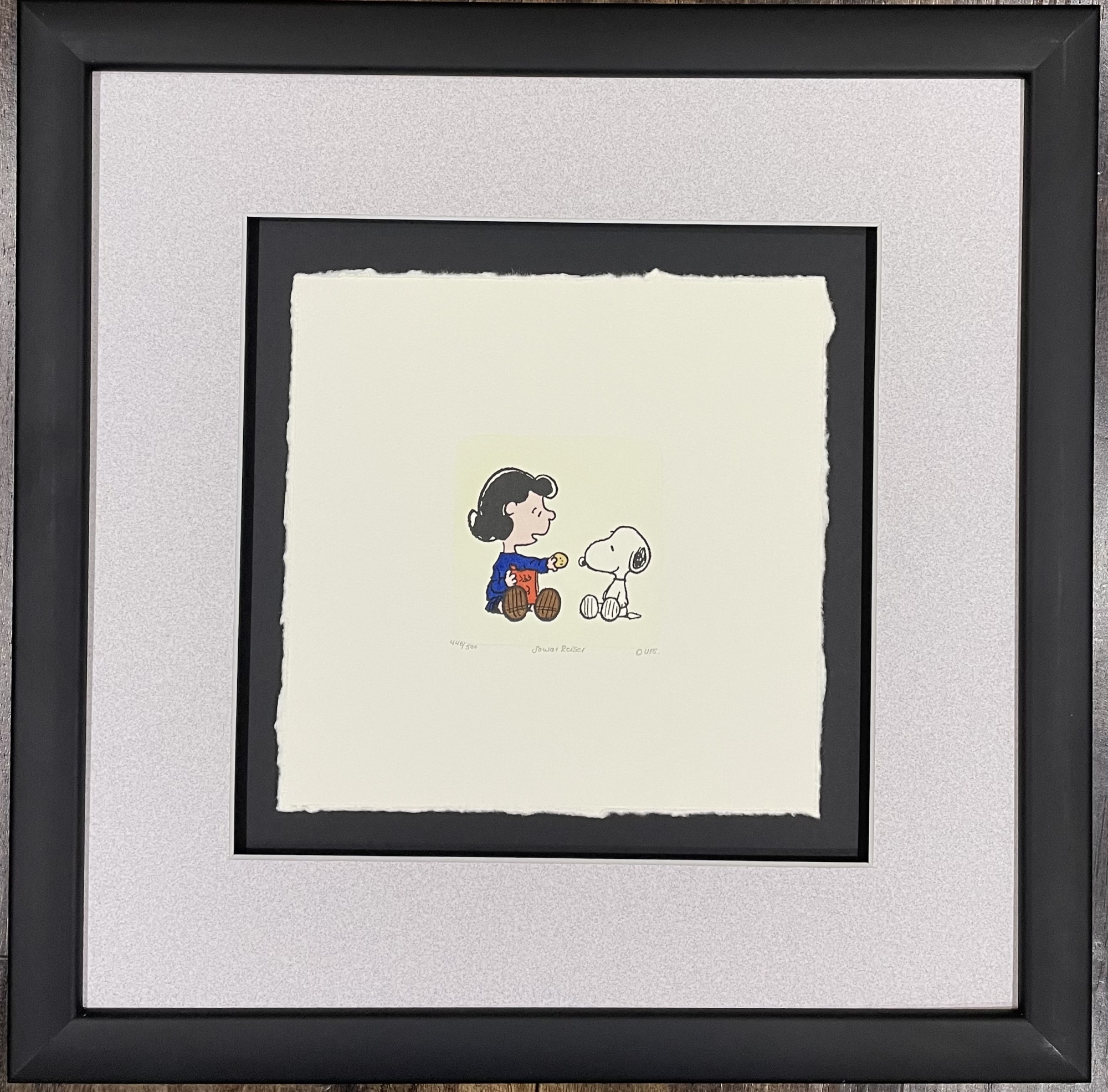 A rare moment of friendship between rivals Lucy & Snoopy. Available unframed for only $75US!