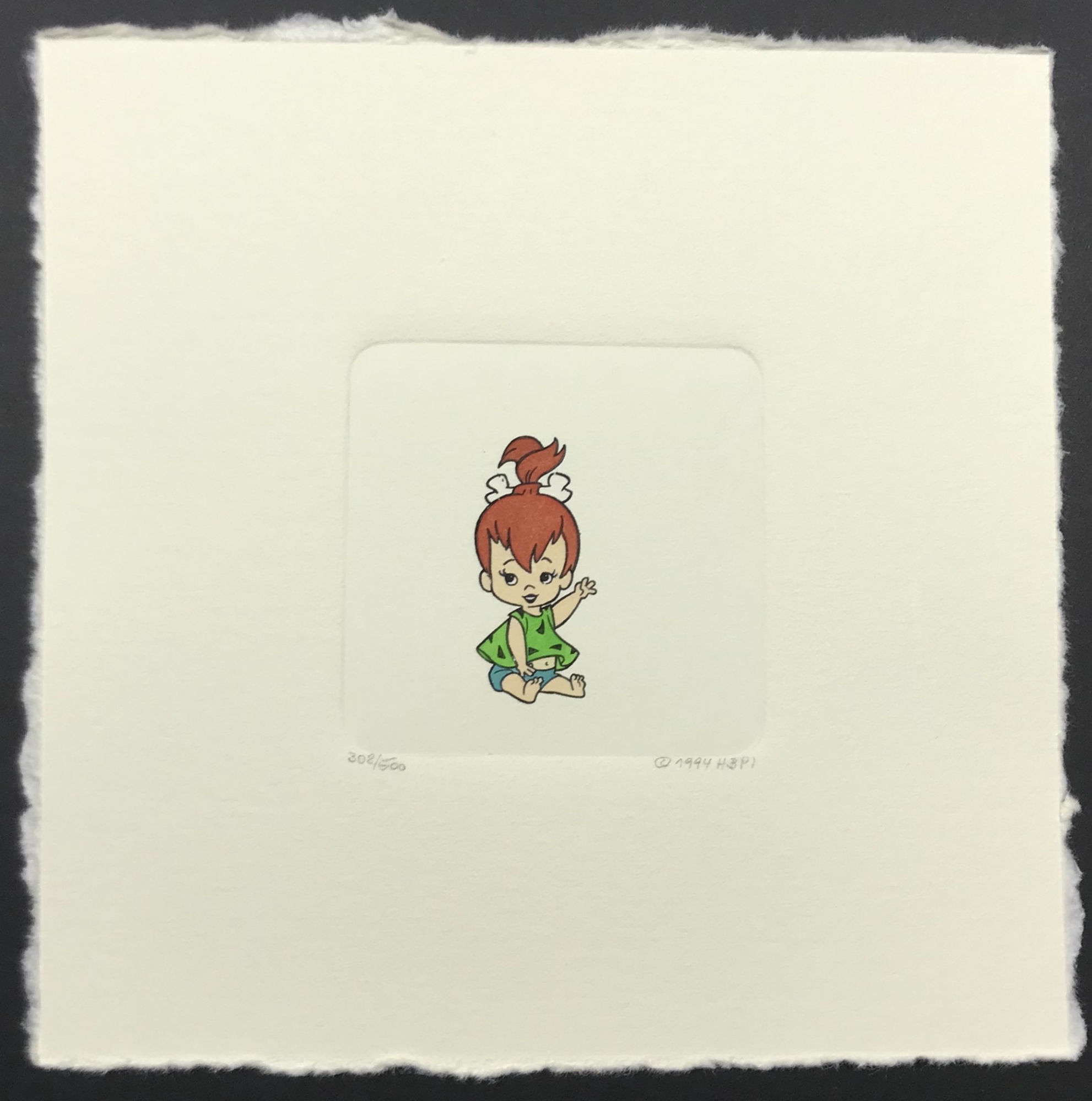 Pebbles Flintstone is featured in the animation art hand painted etching. Available framed for only $129US!