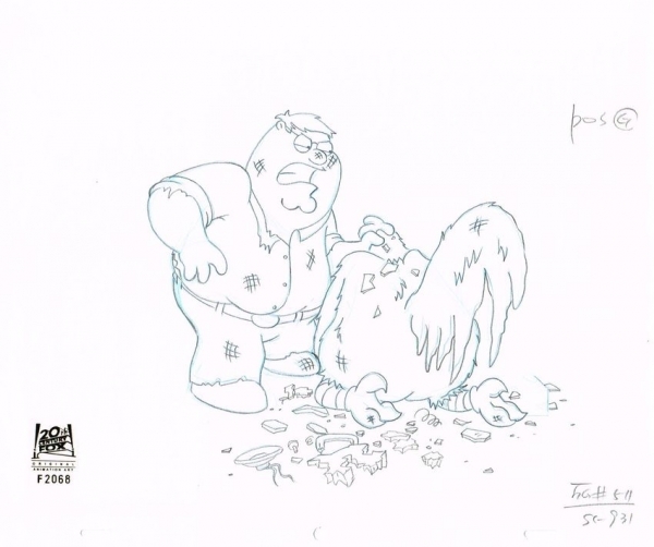 This is an original production drawing used in making an episode of "Family Guy". Episode title "No Chris Left Behind", May 6, 2007 (Season 5). Featured here is Peter Griffin and the Chicken.200
