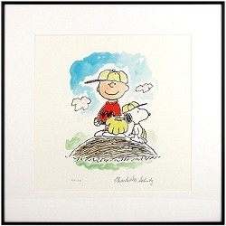Play Ball - Charles Schulz hand signed lithograph. This is a rare sold out limited edition lithograph. Featured here is Charlie Brown and loveable sidekick Snoopy, in a classic baseball moment. Original release date 1995. This is personally signed by the late Charles Schulz. SOLD CALL FOR OTHER CHARLES SCHULZ ARTWORK.
