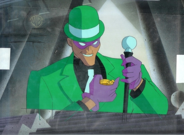 This is an original hand painted production animation cel. Featured here is Riddler.400