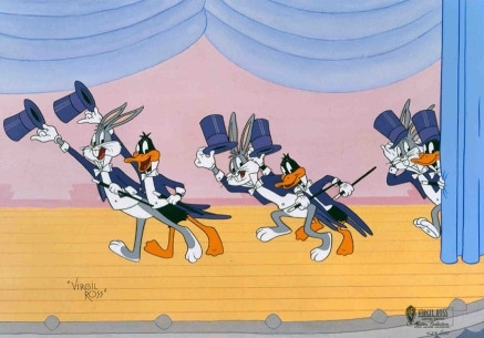 This is a hand painted limited edition cel. This limited edition cel is based on newly created drawings of one of Virgils' favorite scenes from the classic Looney Tunes cartoon, "Show Biz Bugs" (1957). This engaging edition recreates the attitude and entertainment prowess of two of Warner Bros. favorite center staggers, Bugs Bunny and Daffy Duck. Classic animator, Virgil Ross, who is best known for his distinctive style, character personality and fluid animation, recreates the true sense of animation in this multiple image limited edition series entitled, the "Sequential Series". This edition was created from original Virgil Ross pencil drawings, the edition is hand-inked, hand painted and individually numbered. Each piece is hand-signed by Virgil Ross.2500