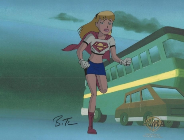 The production cel pictured here is one-of-a-kind and was used in the creation of an animated film or television show. Each is hand-painted, and has been photographed over a background painting to create a frame of the finished production. Because one background is used under a sequence of cels, the production art is usually sold with a reproduction of the original background. The move to computerized animation has severely curtailed the supply of artwork on the market. To own an original production cel is to own a frame of the actual cartoon. This has been signed by Bruce Timm