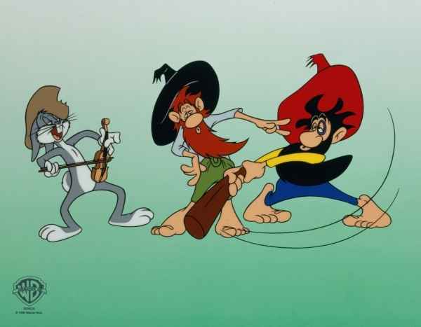 This is a limited edition serigraph cel. Swing Your Partner is from the 1950, Robert McKimson cartoon "Hillbilly Hare". While Bugs Bunny is vacationing in the Ozarks he runs into two hillbilly brothers, Curt and Punkin head who think Bugs would make a tasty meal. In this scene Bugs decides to have some fun with the brothers while they are square dancing. Unbeknownst to the brothers Bugs unplugs the jukebox and takes over the fiddling and square dance calling, giving Curt and Punkin head a series of increasingly bizarre and violent directions, which are followed by the brothers with hilarious results.