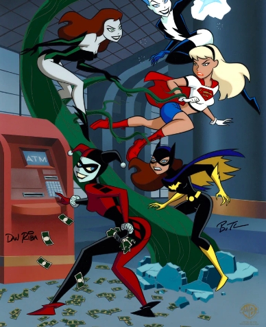 Inspired by the classic crossover series, Girl's Nite Out, which appeared in The New Batman/Superman Adventures, this piece features Harley Quinn, Livewire, Poison Ivy, Batgirl and Super Girl. This is signed by Bruce Timm and Dan Riba. Available unframed only.