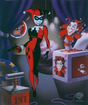 The Girl Jester of the Prince of Knaves, former criminal psychiatrist Dr. Harleen Quinzel strikes a sultry pose in this hand-painted limited edition cel.